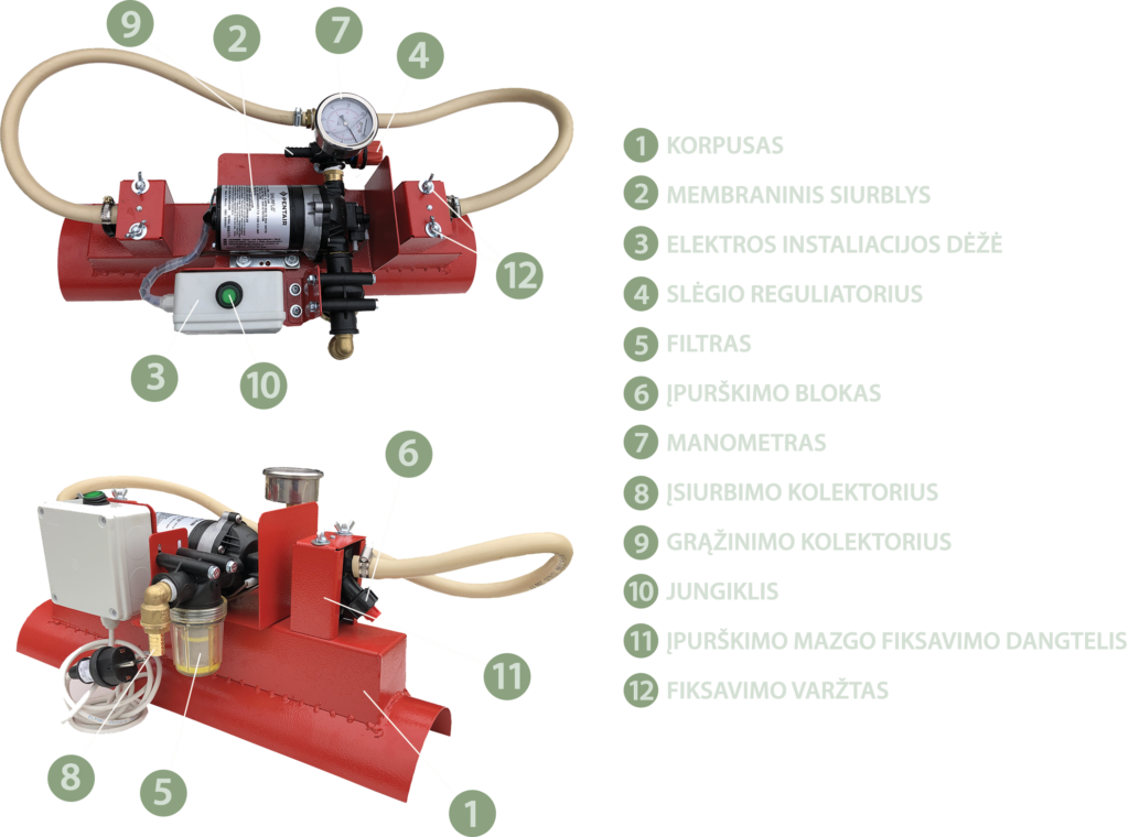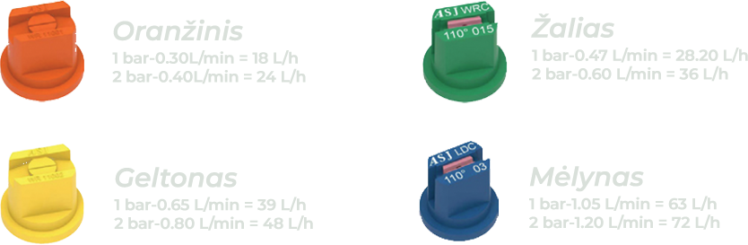 4 komplektai skirtingų purkštukų, ilgos žarnos, sąvaržos bei paketas tvirtinimui prie transporterio, speciali talpa tiksliam išpurškiamo kiekio nustatymui